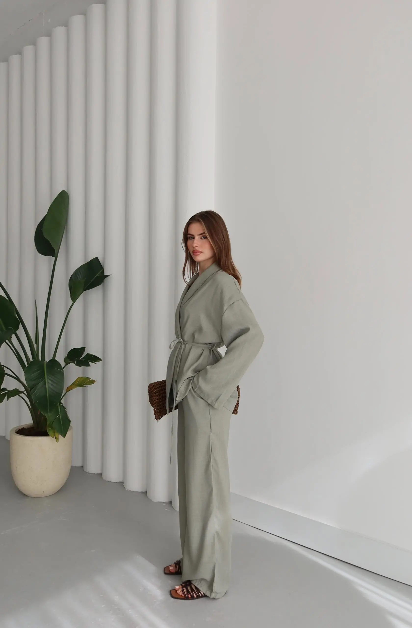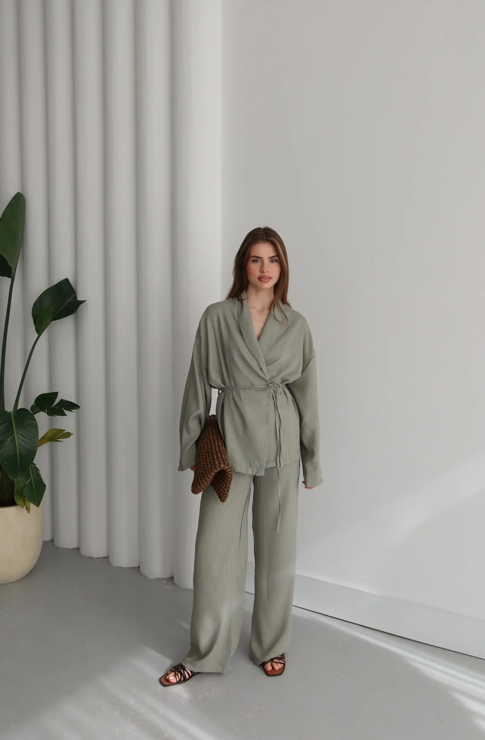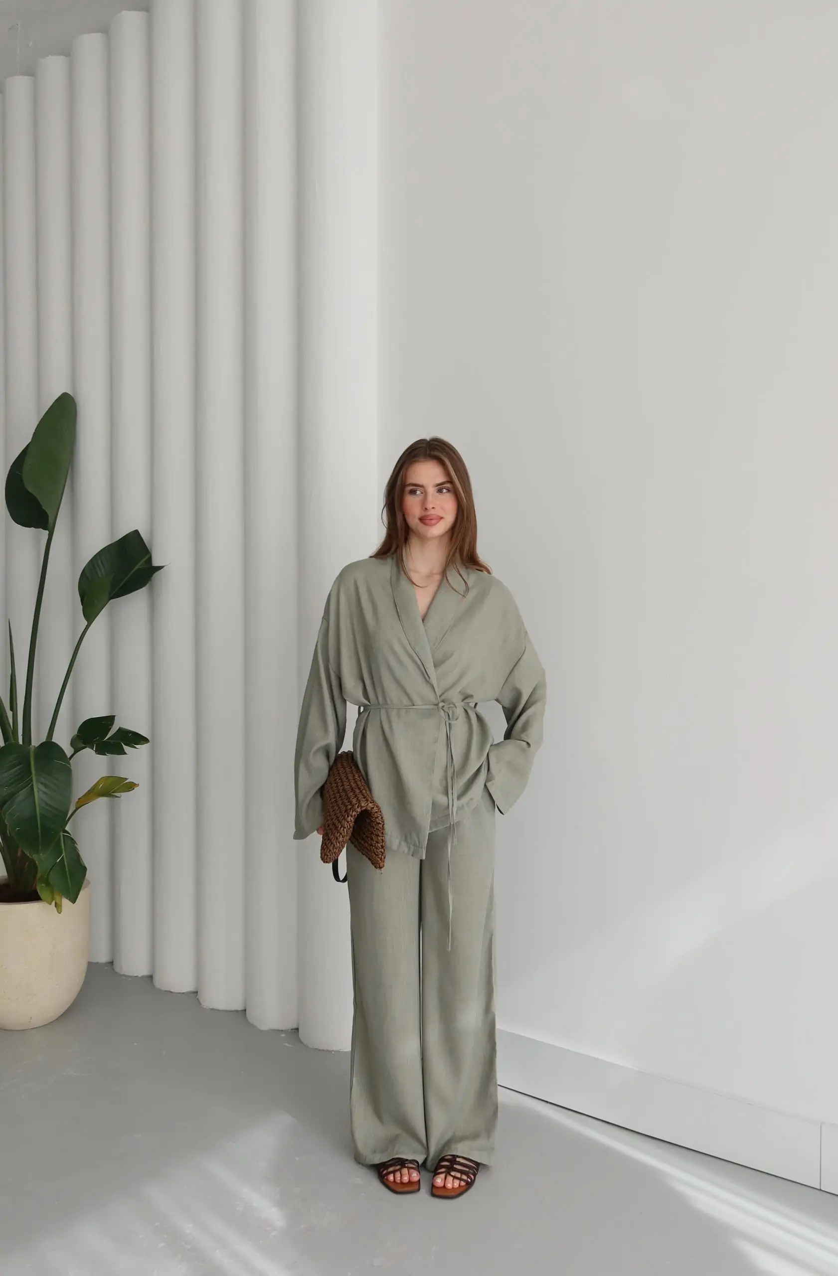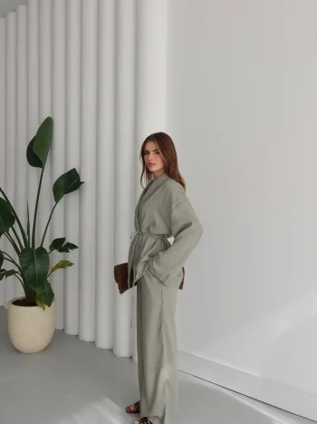 Çağla Yeşili Şal Yaka Keten Takım
